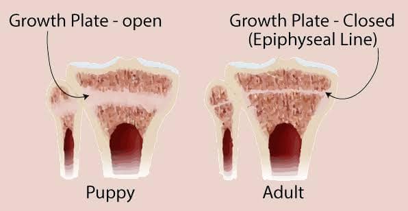 Growth plates (also called epiphyseal plates) are soft areas of cartilage located at the ends of long bones. As your puppy matures, these plates slowly harden (calcify) and turn into solid bone.